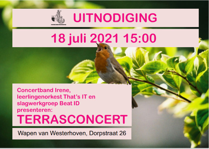 Op zondag 9 juli as. sluit fanfare Irene haar muzikaal jaar af met een terrasconcert. Het vindt plaats op het Mgr. Biermansplein in het centrum van Westerhoven . Voor u treden op de slagwerkgroep Beat Id olv. Martijn Soors, leerlingenorkest That’s It en fanfare Irene en Concertband olv. dirigente Karin van Dijk. Wij nodigen u van harte uit en u kunt […]